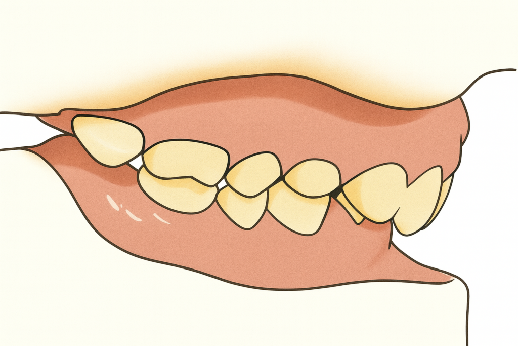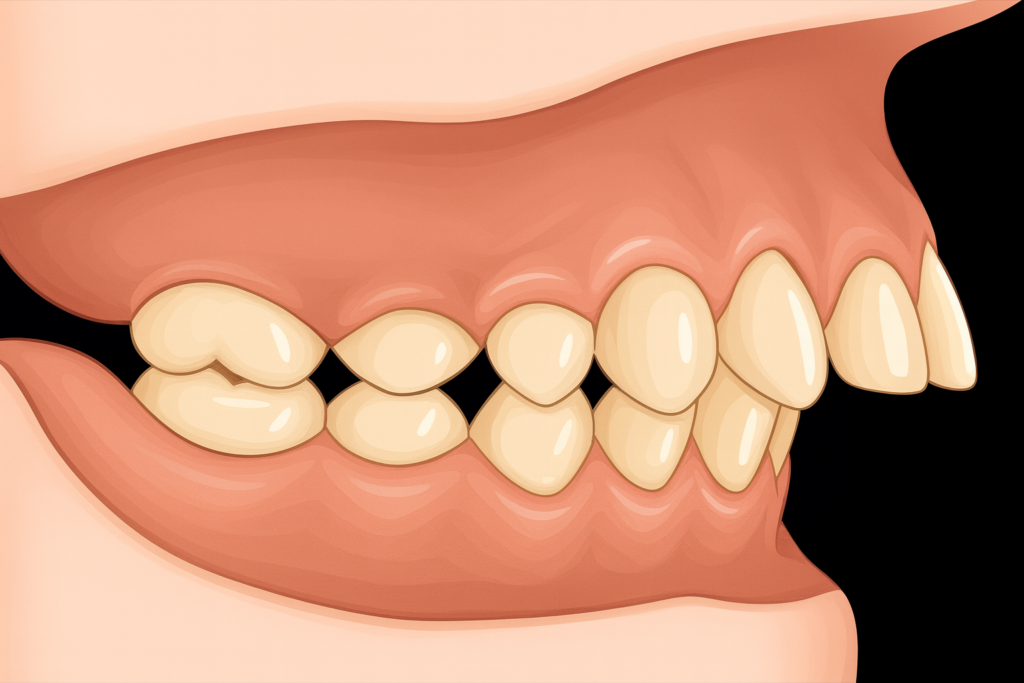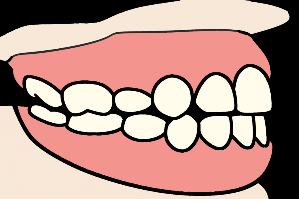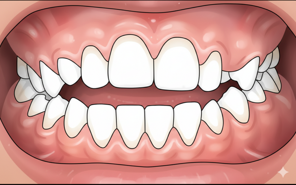 חוסר מקום לבקיעת שיניים בקשת אחידה ומושלמת (לעיתים המראה הוא של שן "רוכבת" על שן אחרת ו/או שיניים שבקעו במקום חריג מהמקום הרגיל שלהן ("בקיעה אקטופית")