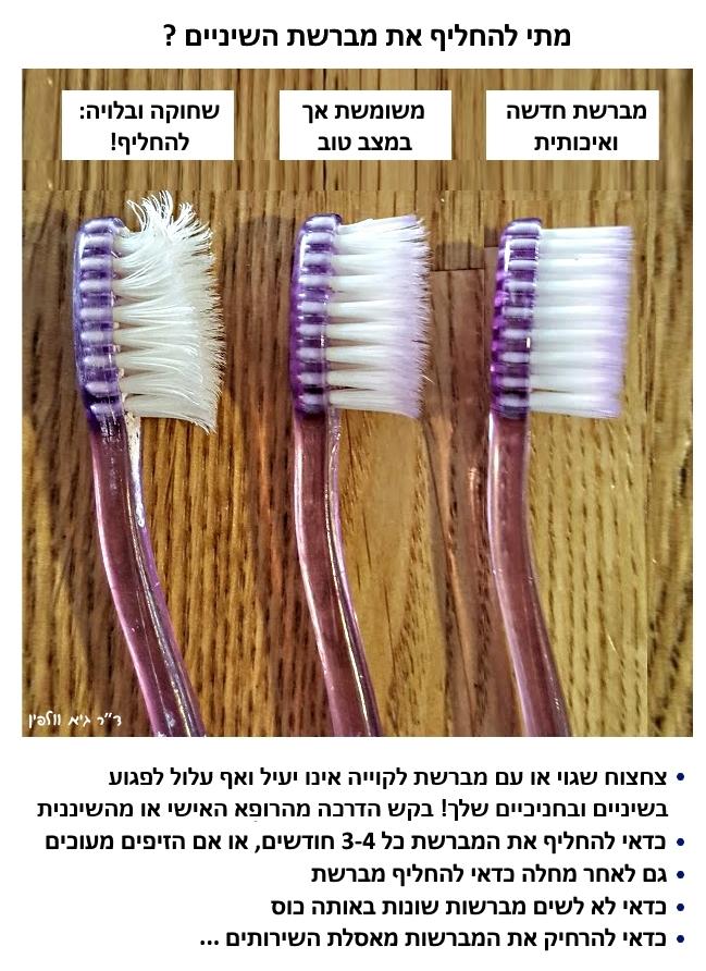 - המברשת הנכונה היא מברשת עדינה ולא גדולה, בעלת סיבים רכים ועדינים. אם עברו 3 חודשים, כדאי להחליף מברשת שיניים. אם סיבי המברשת כבר נראים מעוכים ולא ישרים וזקופים כדאי להחליפה.