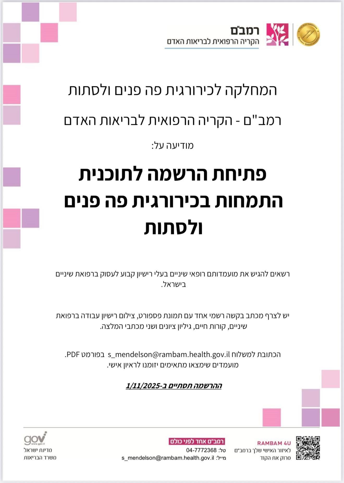 נפתחה ההרשמה לתוכנית ההתמחות בכירורגיה פה פנים ולסתות, בקריה הרפואית רמב"ם.